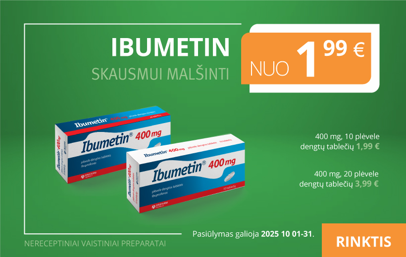 Veiklioji medžiaga: 1 tabletėje yra 200 mg arba 400 mg ibuprofeno. Indikacijos: trumpalaikis silpno ar vidutinio stiprumo skausmo, tokio kaip galvos, dantų, raumenų, sąnarių ar sukelto menstruacijų, malšinimas. Vartojimo būdas ir dozavimas: suaugusiesiems ir vyresniems nei 12 m. paaugliams įprasta vienkartinė dozė yra 1-2 tabletė(s) IBUMETIN 200 mg arba 1 tabletė IBUMETIN 400 mg. Didžiausia paros dozė yra 1200 mg. Tabletę reikia užsigerti stikline vandens. Kontraindikacijos: padidėjęs jautrumas ibuprofenui arba bet kuriai pagalbinei vaisto medžiagai, acetilsalicilo rūgščiai arba kitiems nesteroidiniams vaistams nuo uždegimo (NVNU). Ligonis anksčiau sirgo acetilsalicilo rūgšties arba kitokių NVNU sukelta astma, angioneurozine edema, dilgėline, rinitu ar kitokia padidėjusio jautrumo reakcija. Aktyvi arba buvusi skrandžio ar dvylikapirštės žarnos opa, opinis kolitas, kraujavimas iš virškinimo trakto ar kitoks kraujavimas, sunkus kepenų, širdies, inkstų funkcijos nepakankamumas, hemoraginė diatezė, paskutinių 3 nėštumo mėnesių ar žindymo laikotarpis. Vaikams ir paaugliams iki 12 m. vartoti negalima. Specialūs įspėjimai: specialių atsargumo priemonių reikia, jei inkstų, kepenų arba širdies funkcija yra sutrikusi, yra buvę virškinimo trakto pažeidimų, sutrikęs kraujo krešėjimas arba vartojami antikoaguliantai, jei vartojama kitų NVNU ar vaistinių preparatų, galinčių padidinti skrandžio opos susidarymo arba kraujavimo pavojų, diuretikų ar nefrotoksinį poveikį turinčių vaistinių preparatų, sergama cukriniu diabetu, raudonąja vilklige ar kitomis kolagenozėmis, Krono liga, opiniu kolitu, hipertenzija, periferinių arterijų liga, galvos smegenų kraujagyslių liga, astma, šienlige, yra nosies polipų ar lėtinių infekcinių kvėpavimo takų ligų, senyviems žmonėms. Prasidėjus kraujavimui, atsiradus opų ar odos reakcijų, vartojimą būtina nedelsiant nutraukti ir kuo skubiau kreiptis į gydytoją. Negalima vartoti, jei nustatytas paveldimas sutrikimas – Lapp laktazės stygius arba gliukozės ir galaktozės malabsorbcija. Pirmuosius 6 nėštumo mėnesius vartoti negalima, nebent tai neabejotinai būtina ir taip pataria gydytojas. Teksto parengimo data: 2023-03-01