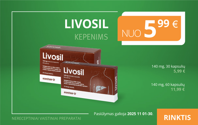 Veikliosios medžiagos, stiprumas: 1 kietojoje kapsulėje yra 140 mg silimarino. Indikacijos: papildomas lėtinio hepatito, kepenų cirozės ir toksinio kepenų pažeidimo gydymas. Vartojimo būdas ir dozavimas: suaugusiems žmonėms rekomenduojama „Livosil“ dozė yra 280–420 mg per parą. Gerti po 1 kapsulę (140 mg) 2–3 kartus per dieną. Kapsulių nekramtyti, užgerti nedideliu kiekiu skysčio. „Livosil“ rekomenduojama vartoti ilgiau nei 3 mėnesius. Kontraindikacijos: padidėjęs jautrumas veikliajai arba bet kuriai pagalbinei „Livosil“ medžiagai. Specialūs įspėjimai: silimarinas gali mažinti gliukozės koncentraciją kraujyje. Todėl rekomenduojama stebėti pacientus, sergančius cukriniu diabetu ar su sumažėjusia gliukozės koncentracija kraujyje (hipoglikemija), bei tuos, kurie vartoja preparatų, maisto papildų ar kitokių produktų, darančių įtaką gliukozės koncentracijai. Teksto peržiūros data 2017-07-12.