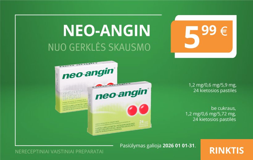 Specialūs įspėjimai. Pasitarkite su gydytoju arba vaistininku, prieš pradėdami vartoti „neo-angin“. Reklamos teksto parengimo data 2025.01.31.