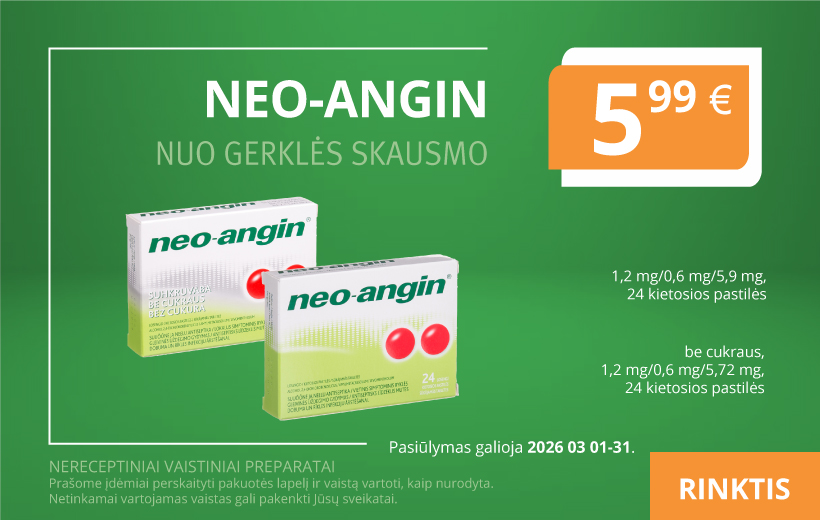 Veikliosios medžiagos, stiprumas. Vienoje kietojoje pastilėje yra: „neo-angin“ – 1,20 mg 2,4-dichlorbenzilo alkoholio, 0,60 mg amilmetakrezolio ir 5,90 mg levomentolio; „neo-angin“ be cukraus – 1,20 mg 2,4-dichlorbenzilo alkoholio, 0,60 mg amilmetakrezolio ir 5,72 mg levomentolio. Indikacijos. „neo-angin“ sukelia vietinį mikrobus naikinantį ir skausmą malšinantį poveikį. 2,4-dichlorbenzilo alkoholis ir amilmetakrezolis turi dezinfekuojamųjų, levomentolis – šaldomųjų ir skausmą malšinančių savybių. „neo-angin“ kietosios pastilės vartojamos vietiniam ryklės gleivinės uždegimo gydymui. Jeigu per 3–4 dienas Jūsų savijauta nepagerėjo arba net pablogėjo, kreipkitės į gydytoją. Vartojimo būdas ir dozavimas. Suaugę žmonės, paaugliai ir vyresni nei 6 metų vaikai kas 2–3 valandas turi lėtai sučiulpti po vieną kietąją pastilę. Didžiausia paros dozė yra 6 pastilės. Nepasitarus su gydytoju, „neo-angin“ vartoti ilgiau nei 3–4 dienas negalima. Kontraindikacijos. Alergija bet kuriai veikliajai arba bet kuriai pagalbinei šio vaisto medžiagai. Specialūs įspėjimai. Pasitarkite su gydytoju arba vaistininku, prieš pradėdami vartoti „neo-angin“. Reklamos teksto parengimo data 2025.01.31.