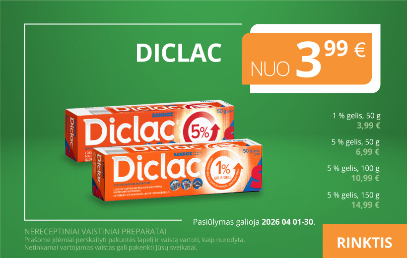 Veikliosios medžiagos, stiprumas: 1 g „Diclac“ 5 % gelio yra 50 mg, 1 g „Diclac“ 1 % gelio yra 10 mg diklofenako natrio druskos. Terapinės indikacijos: lokaliam skausmui malšinti, uždegimui slopinti ir patinimui mažinti. Vartojimo būdas ir dozavimas: ploną „Diclac“ 5 % gelio sluoksnį tepti 2 kartus per dieną, „Diclac“ 1 % gelį tepti 3–4 kartus per dieną. Kontraindikacijos: jautrumas diklofenakui ar pagalbinėms medžiagoms, jaunesni kaip 14 m. vaikai, 3 paskutiniai nėštumo mėnesiai. Specialūs įspėjimai: negalima tepti burnos, nuryti. „Sandoz Pharmaceuticals d.d.“ filialas, Upės g. 21-1, LT-08128 Vilnius, Lietuva. Tel. +370 5 263 6037. El. paštas info.lithuania@sandoz.com. BS2601069663. Reklamos teksto parengimo data 2026-01-06.